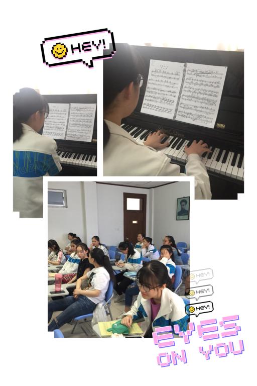 首先为我们带来表演的是丁语同学,她演奏了自改版的《时雨》和克列门蒂《小奏鸣曲》片段。虽然学习钢琴仅一年时间,但其精彩的演绎赢得了全班同学的阵阵掌声。