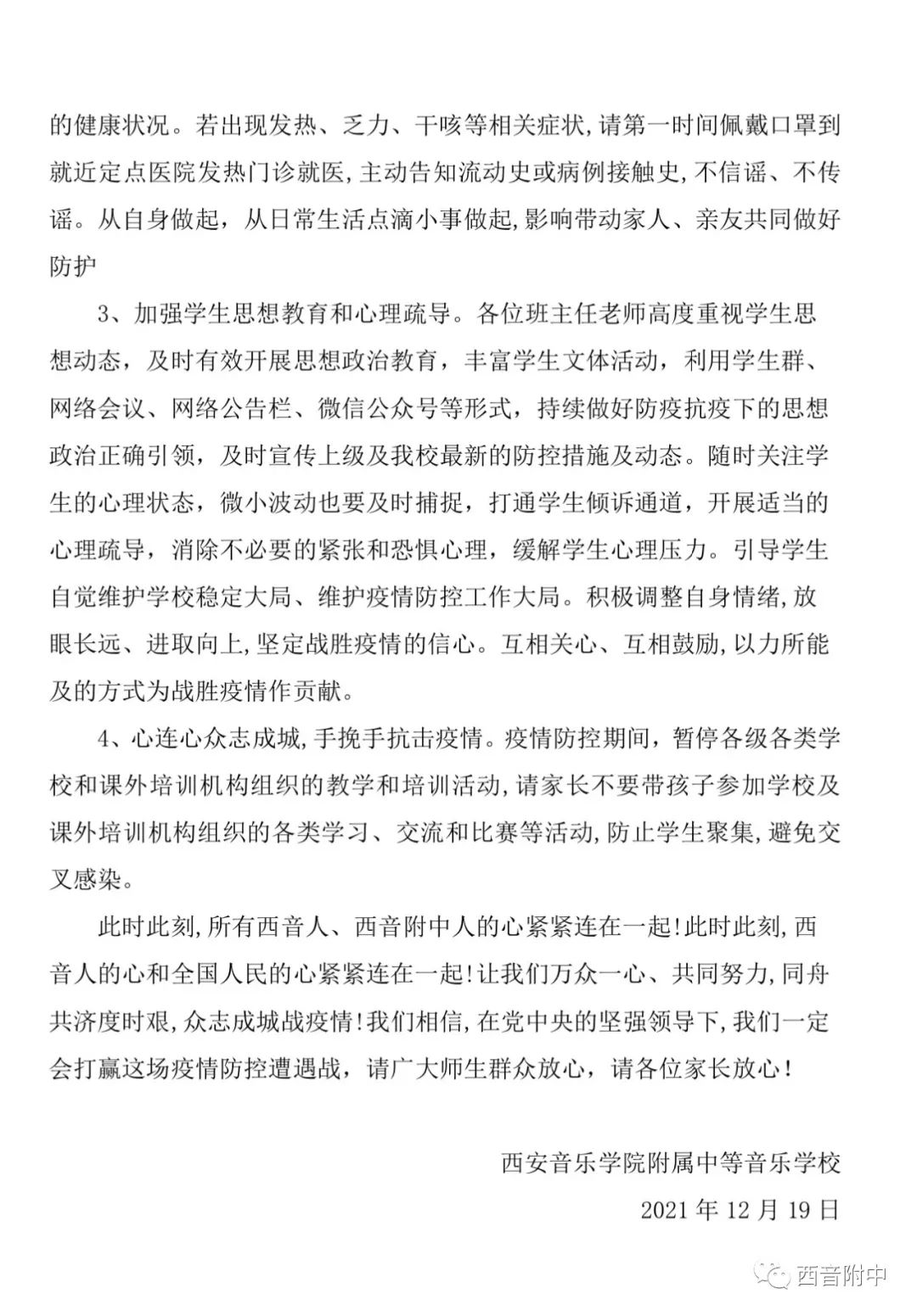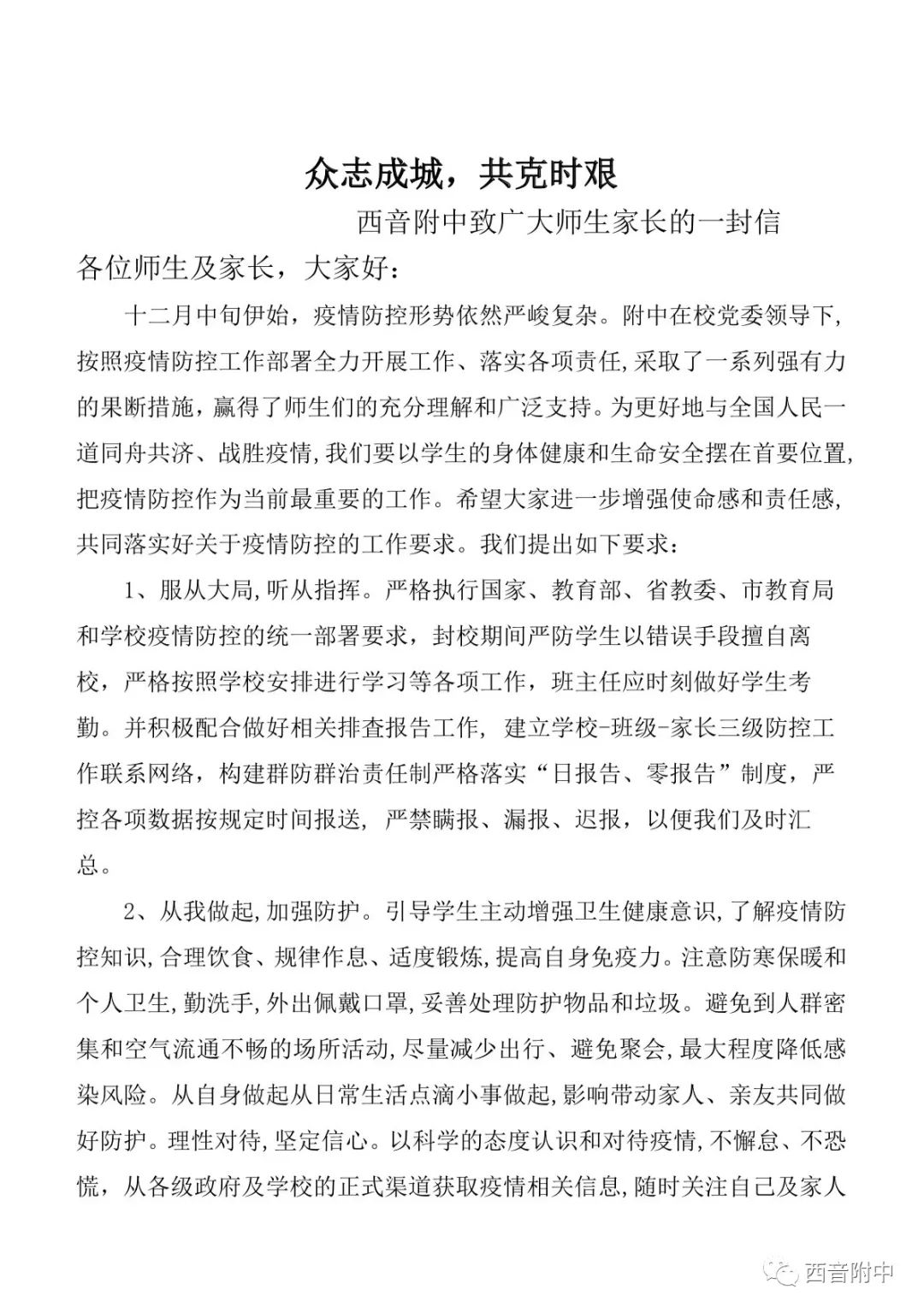 12月中旬,这反反复复的疫情,又偷袭了我们的城市,医护人员奋斗在一线,各行各业响应着号召,全国人民都在尽着自己最大的努力!近期西音附中的教职员工在校党委的安排部署下,附中班子领会精神召开多次紧急会议,有条不紊地进行全方面工作。在校党员教师充分发挥先锋模范带头作用,同附中班子加班查看学生学习生活情况,安排值班排班。封校情况下教职员工们都在校内校外发挥着不同的作用,不论身在哪里,都万众一心,发挥着无私的奉献精神,为保障各项工作可以正常开展,为保护我们封校时学生们学习、生活、身心健康都得以被全面保障而付出心血。