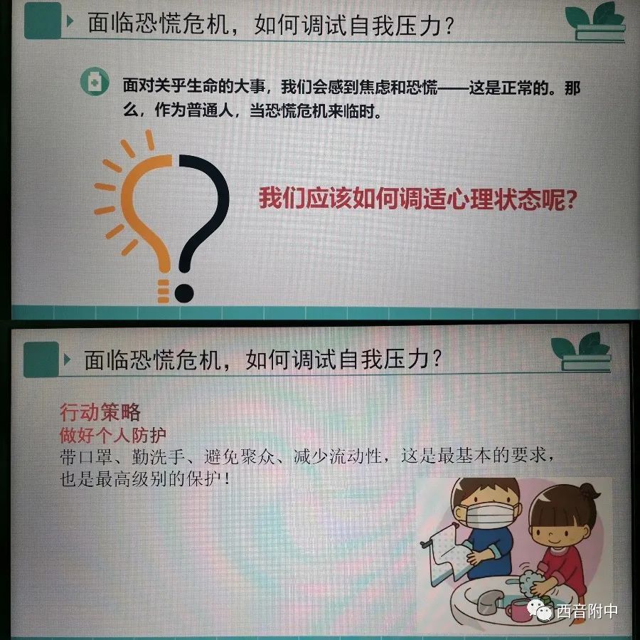 12月16日学院根据雁塔区新冠肺炎疫情防控指挥部办公室“紧急通知”精神,实行封闭式管理。在封校期间附中不仅保证学生们正常学习生活,在附中党支部的引领下,充分加强学生思想教育和心理疏导。要求各位班主任老师高度重视学生思想动态,及时有效开展思想政治教育,我校心理教师周老师,思想政治课王老师,都主动留宿学校,更加贴近学生生活,并针对当前情况制定方案,利用心理课、政治课上对学生进行心理辅导、思想引领。班主任及各科代课教师,随时关注学生的心理状态,微小波动也要及时捕捉,打通学生倾诉通道,开展适当的心理疏导,消除不必要的紧张和恐惧心理,缓解学生心理压力。引导学生自觉维护学校稳定大局、维护疫情防控工作大局。积极调整自身情绪,放眼长远、进取向上,坚定战胜疫情的信心。互相关心、互相鼓励,以力所能及的方式为战胜疫情作贡献。