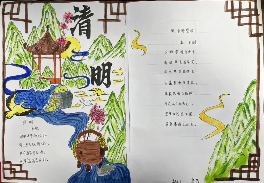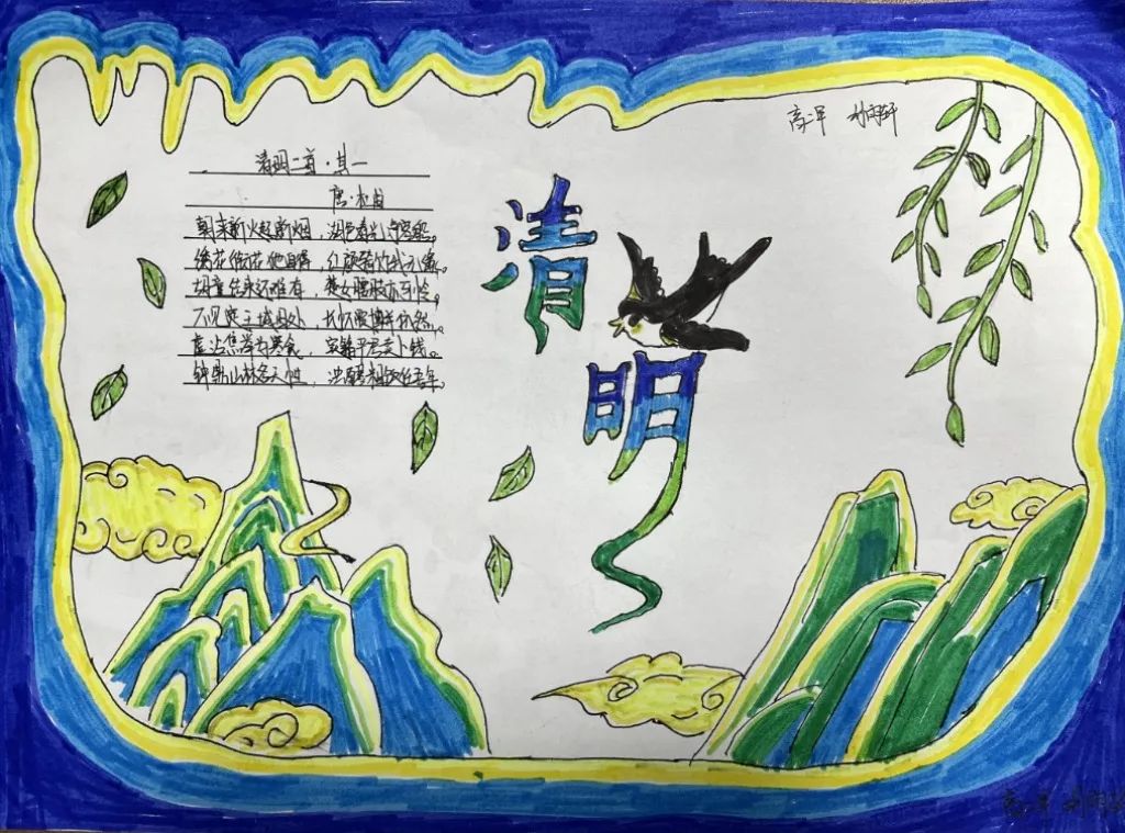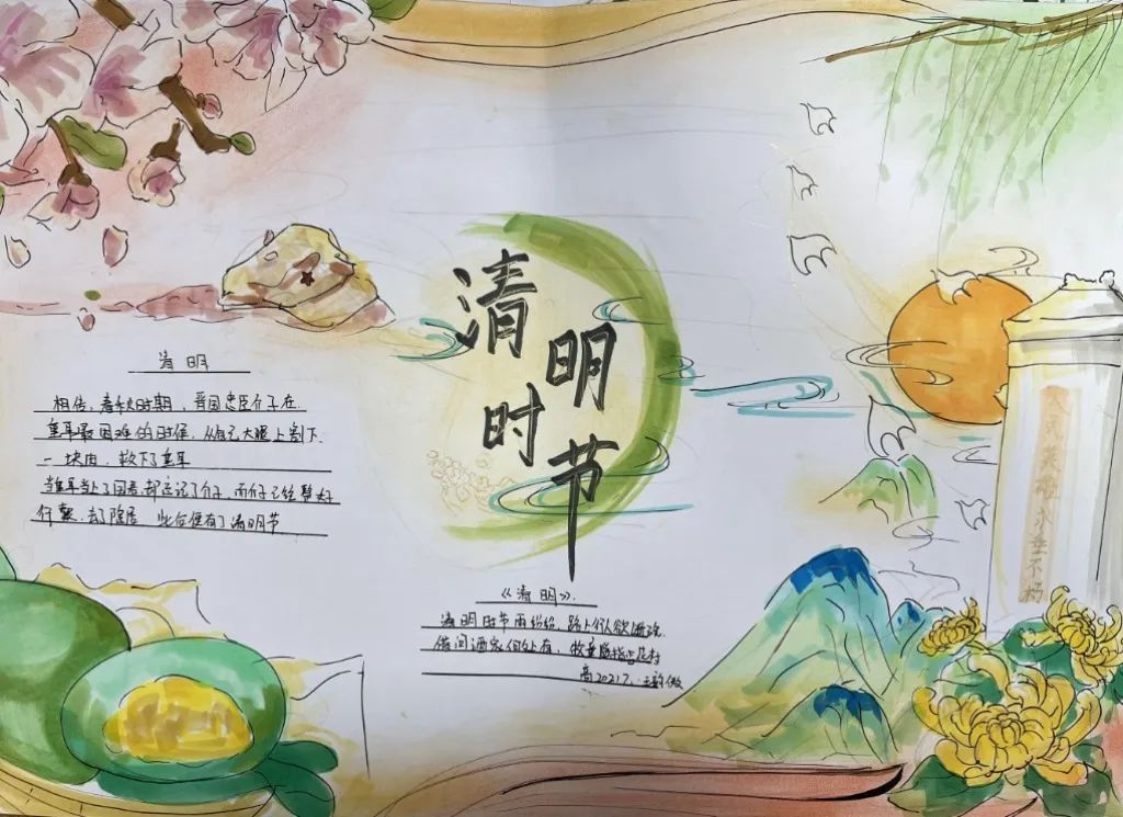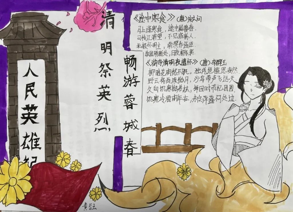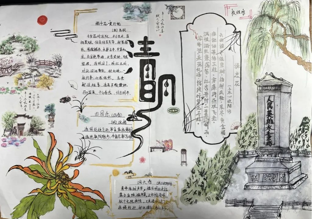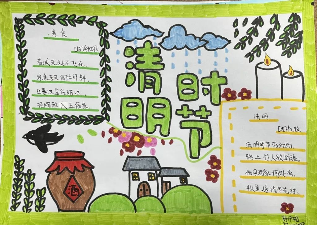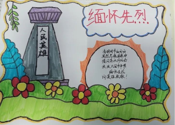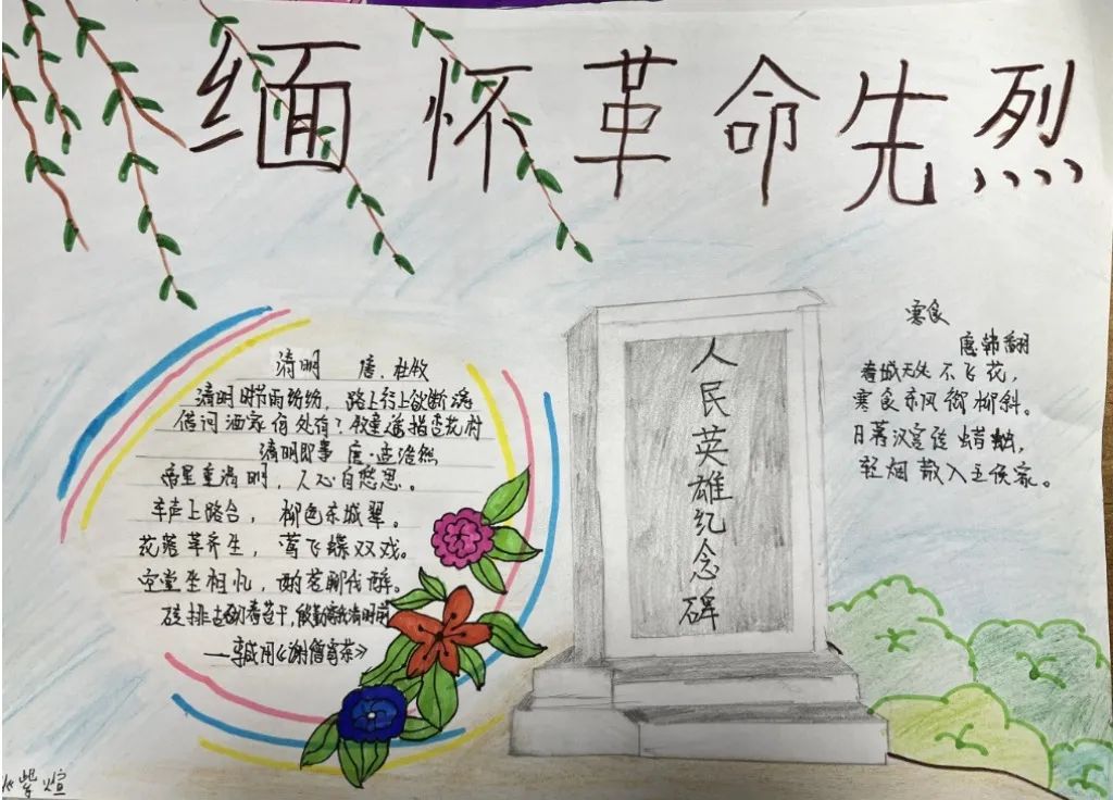古人寄情于诗词,清明之时,抓住契机,引导学生回归传统,传承文化,开展手抄报、诗配画活动。同学们满怀对革命先烈的崇高敬意,循着祖先清明时节春祭的礼俗,用画笔刻下节日的印迹,遥遥追思,致敬先烈英魂。