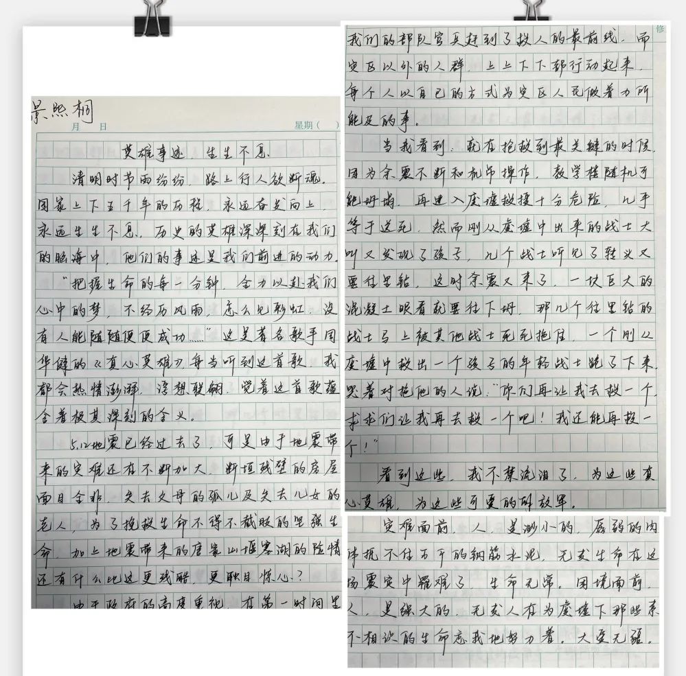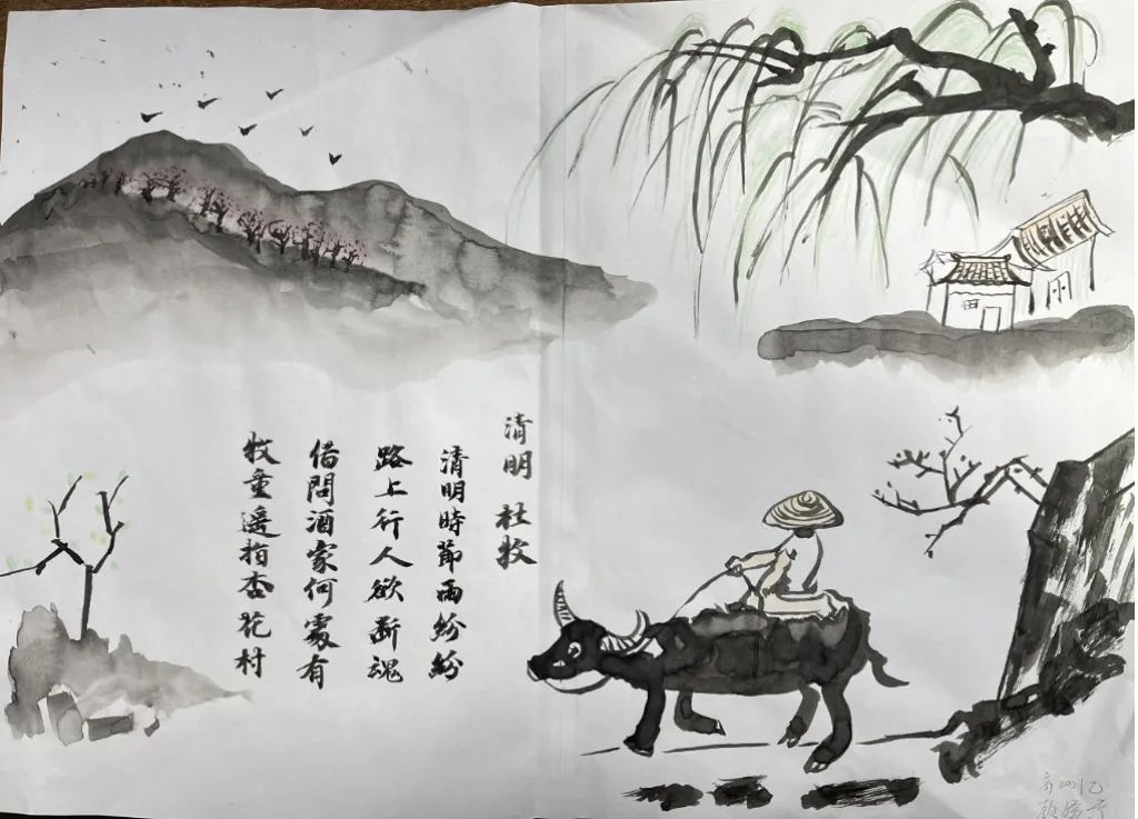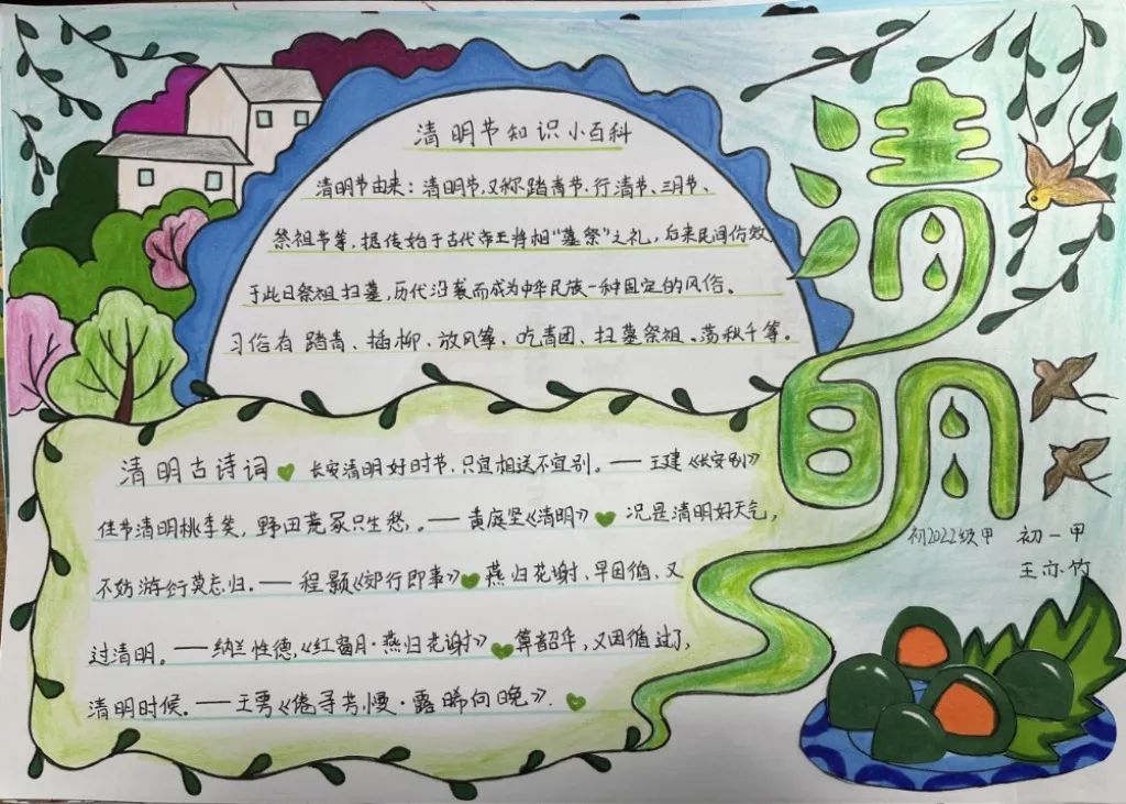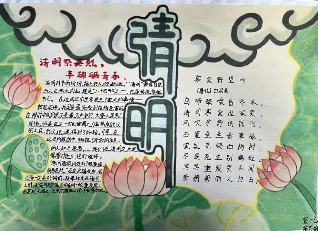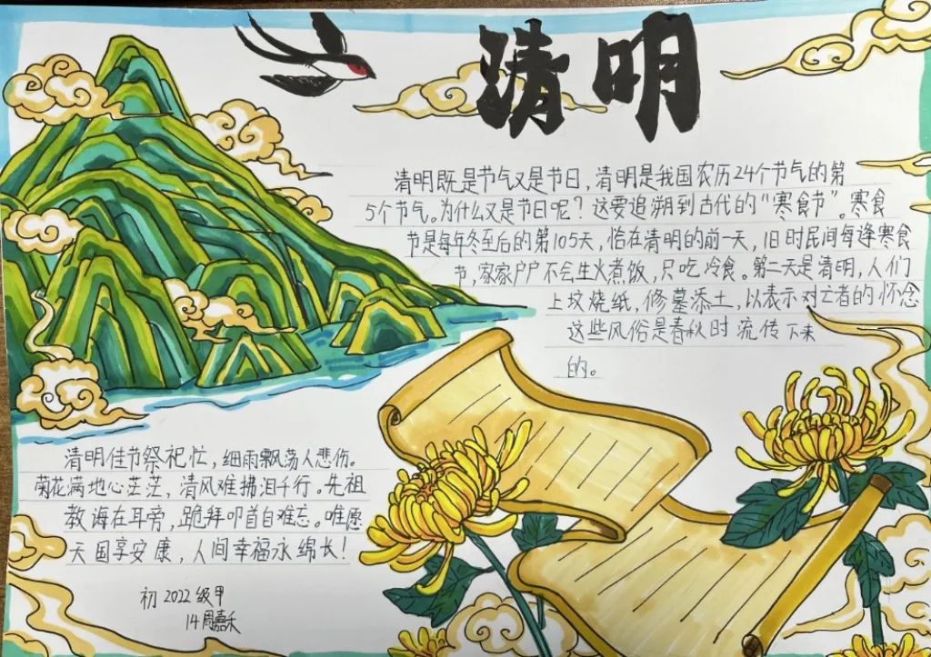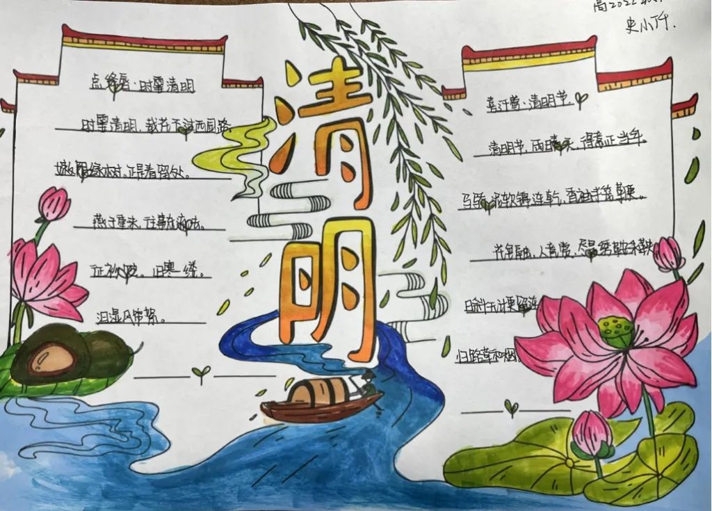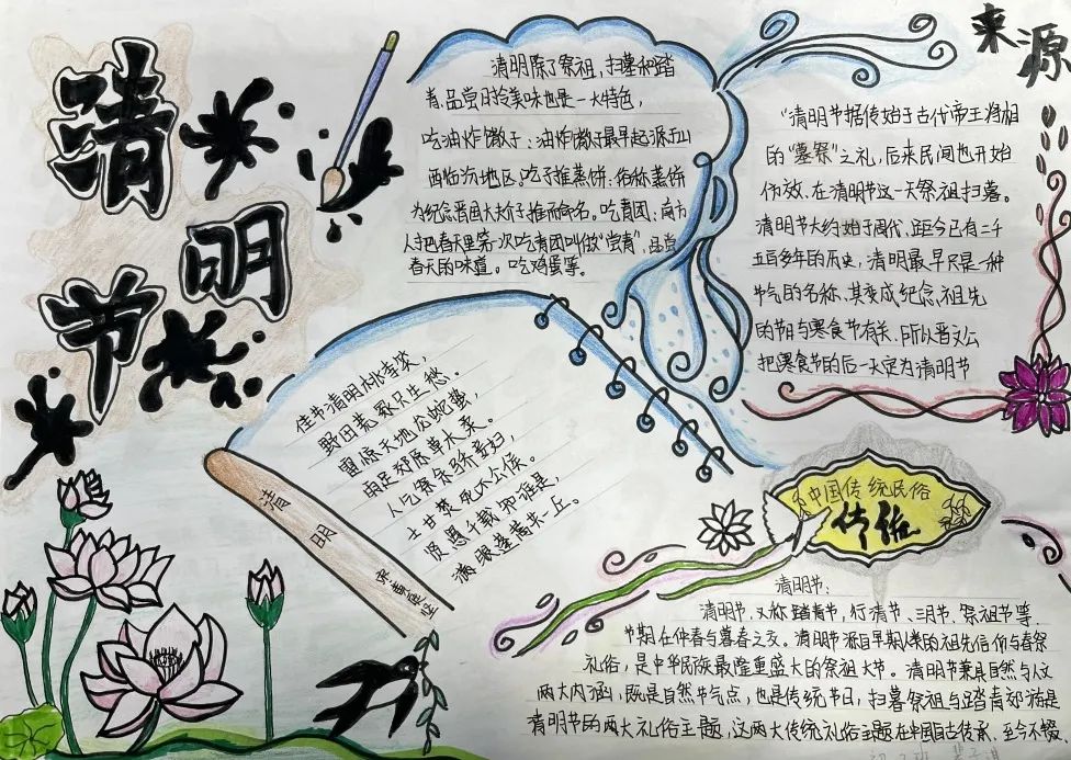古人寄情于诗词,清明之时,抓住契机,引导学生回归传统,传承文化,开展手抄报、诗配画活动。同学们满怀对革命先烈的崇高敬意,循着祖先清明时节春祭的礼俗,用画笔刻下节日的印迹,遥遥追思,致敬先烈英魂。