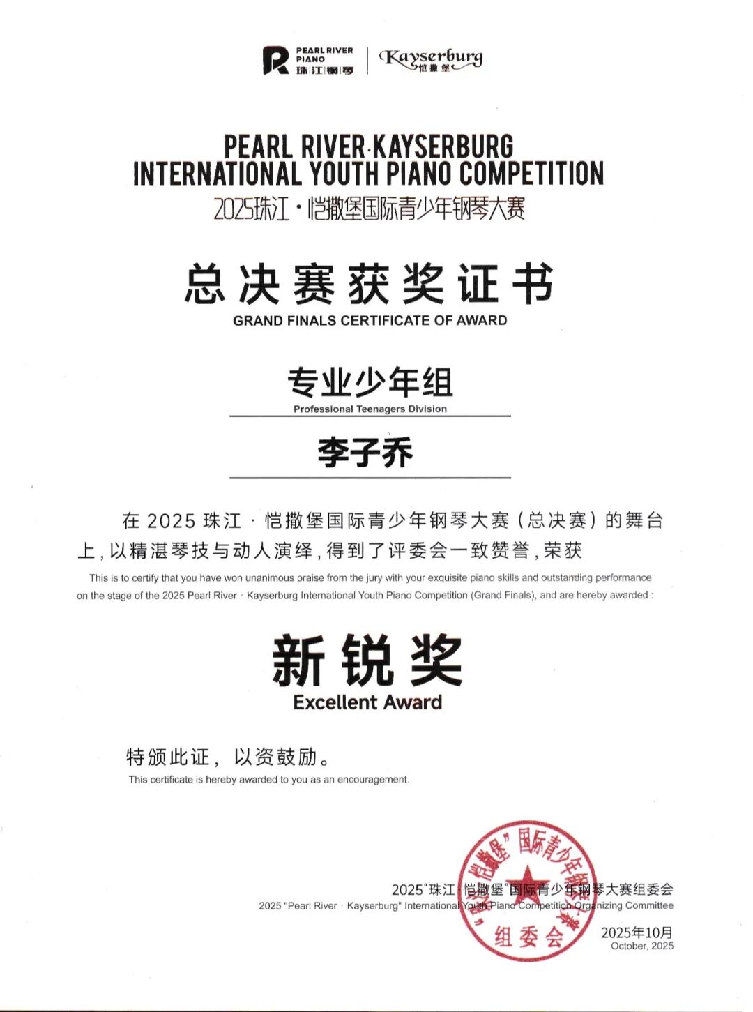 李子乔(高2024级甲班)荣获2025珠江·凯撒堡国际青少年钢琴大赛总决赛-专业少年组“新锐奖”。