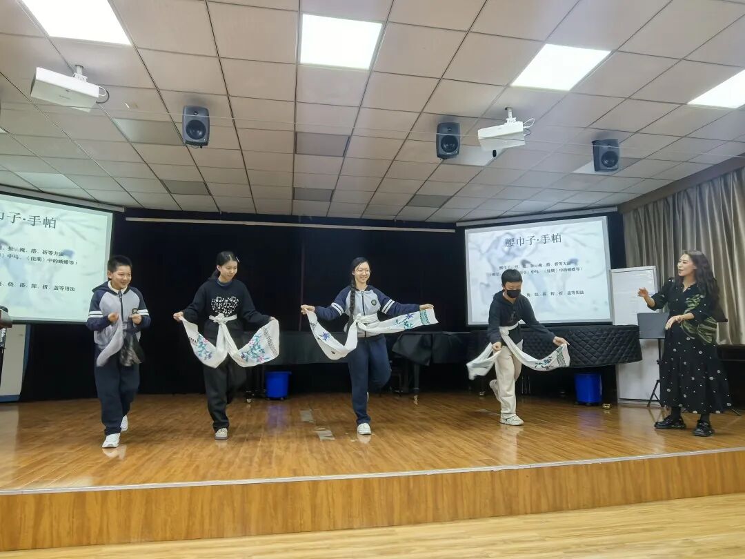 本次讲座的亮点之一是孙伊君对昆曲旦行常用道具的展示与互动环节。她重点展示了腰巾子和手帕两种道具的使用技巧。腰巾子,这条看似简单的长巾,在昆曲表演中有着丰富多样的用法。孙伊君介绍了如何通过腰巾子的舞动,表现人物的喜怒哀乐。“同样是舞动腰巾,欢喜时是轻快飘扬,愤怒时是急促有力,悲伤时是迟缓沉重。”她邀请现场学生上台,亲自指导他们腰巾子的基本握法和舞动技巧。手帕的运用是昆曲旦行的重要技巧。孙伊君展示了手帕的等多种技巧,一种技巧一种情绪,一个动作一种心境。在互动环节,学生们踊跃上台,在孙老师的指导下学习手帕的基本用法。